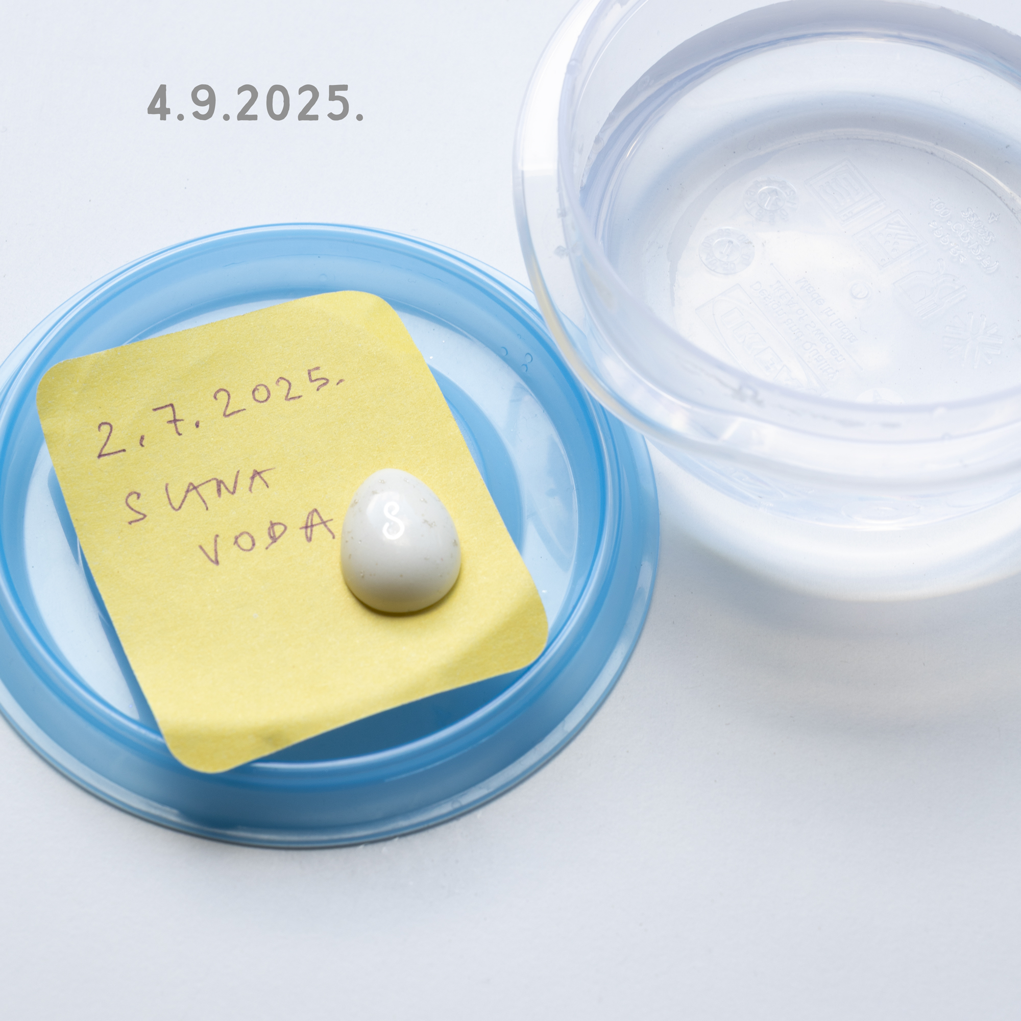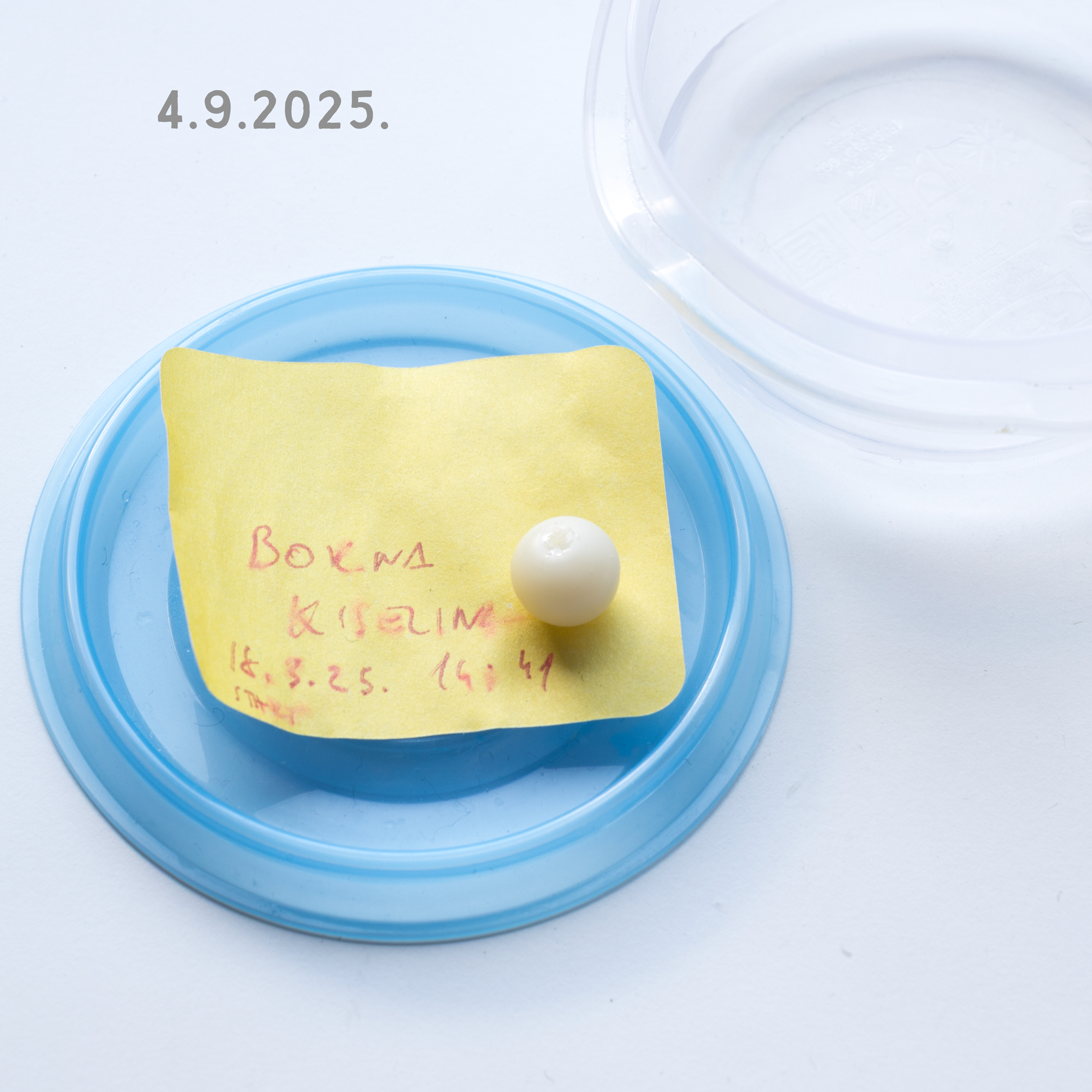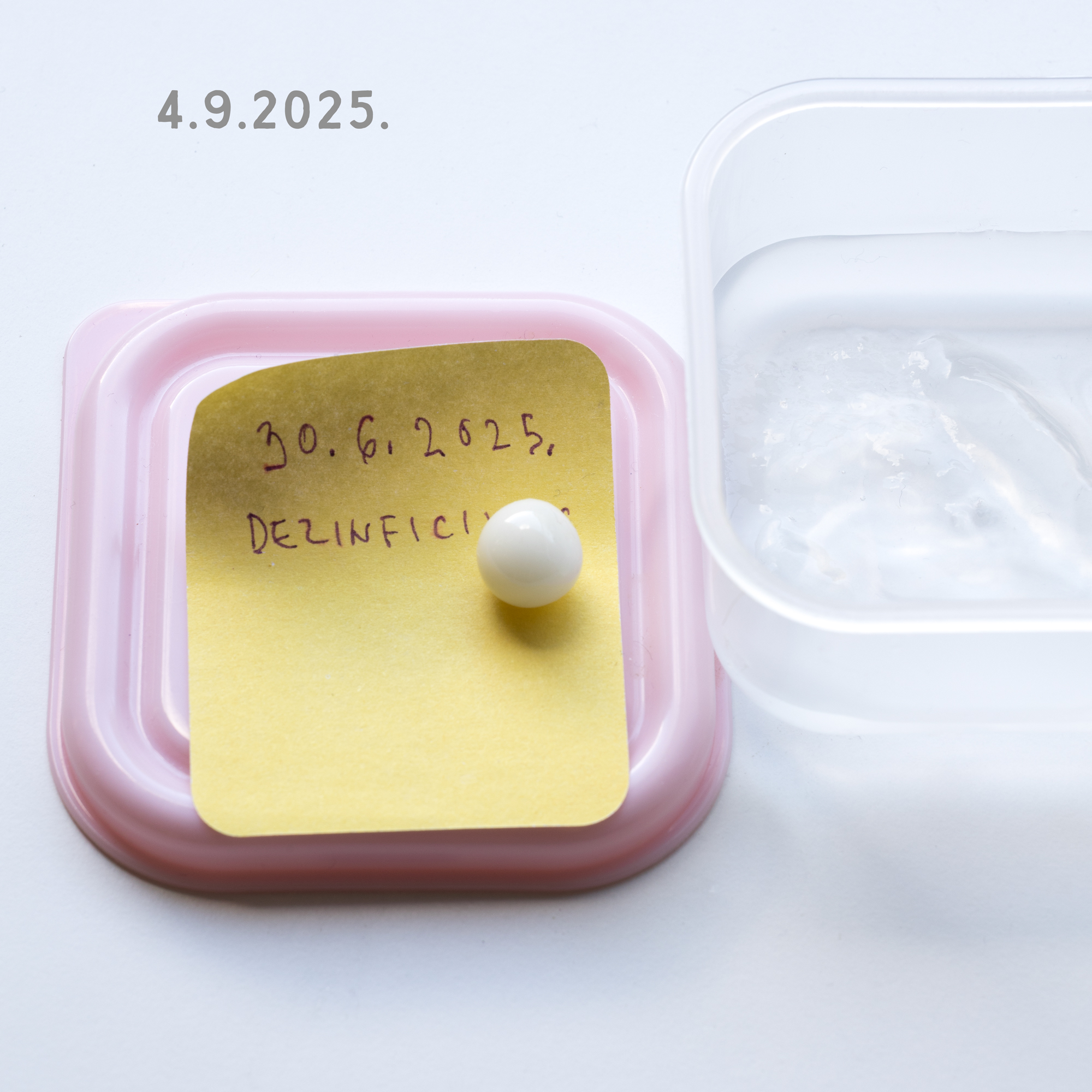 Only breastmilk stones were tested—no metal parts. Samples were continuously immersed as follows: fresh water 6 mo, salt water ≥2 mo, disinfectant ≥2 mo (active substance 70% alcohol), boric acid 5 mo. Photographed on 4 Sept 2025.